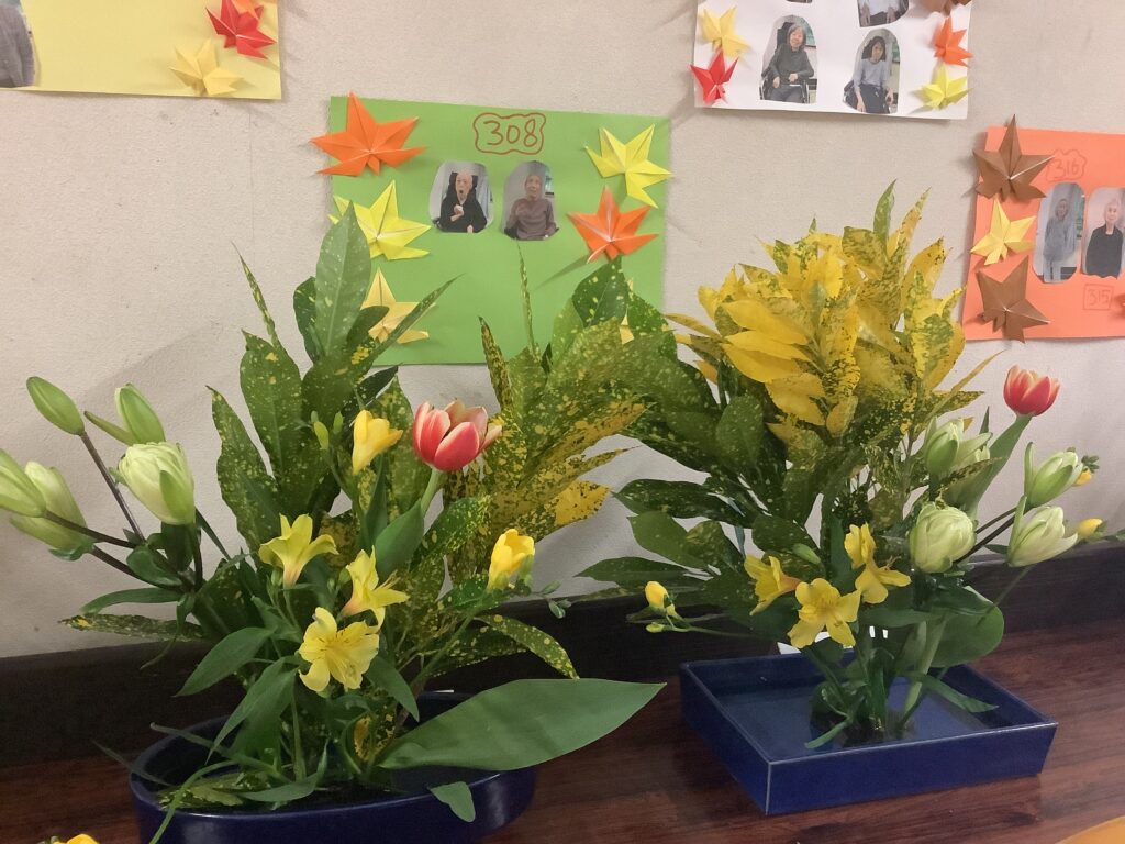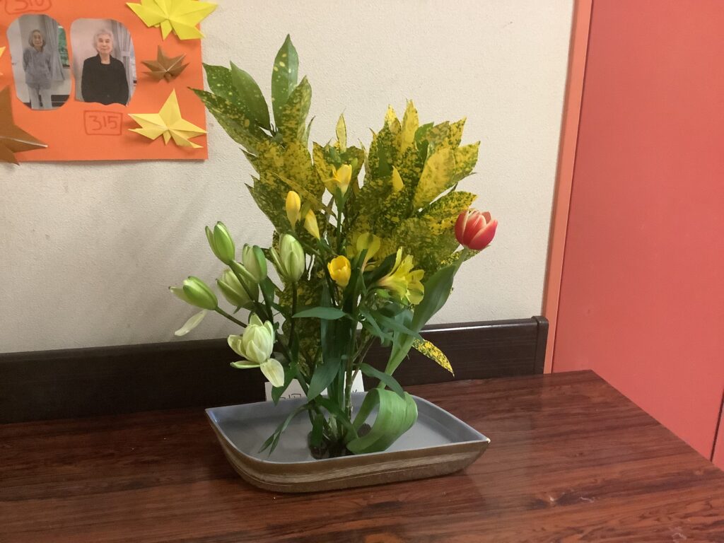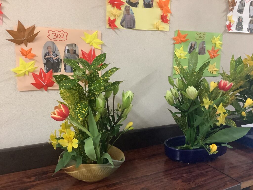 活けられたお花のボリュームも大きく、ご利用者の皆様は通りがかるたびに足を止め、近くでじっくりと眺めていらっしゃいました。