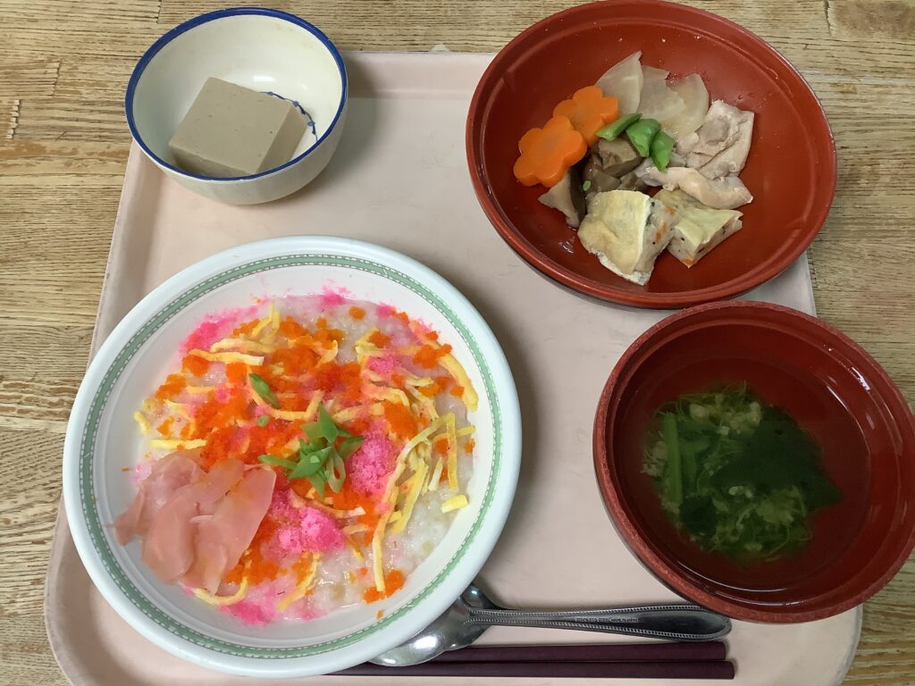 本日のお昼ご飯は、ちらし寿司、炊き合わせ、ごま豆腐、すまし汁をご提供いたしました。