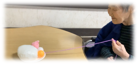 本日は、紙皿の上に雪玉に見立てたボールとウサギの飾り、そして綿を乗せ、落とさないように引っ張っていただくレクリエーションを行いました。