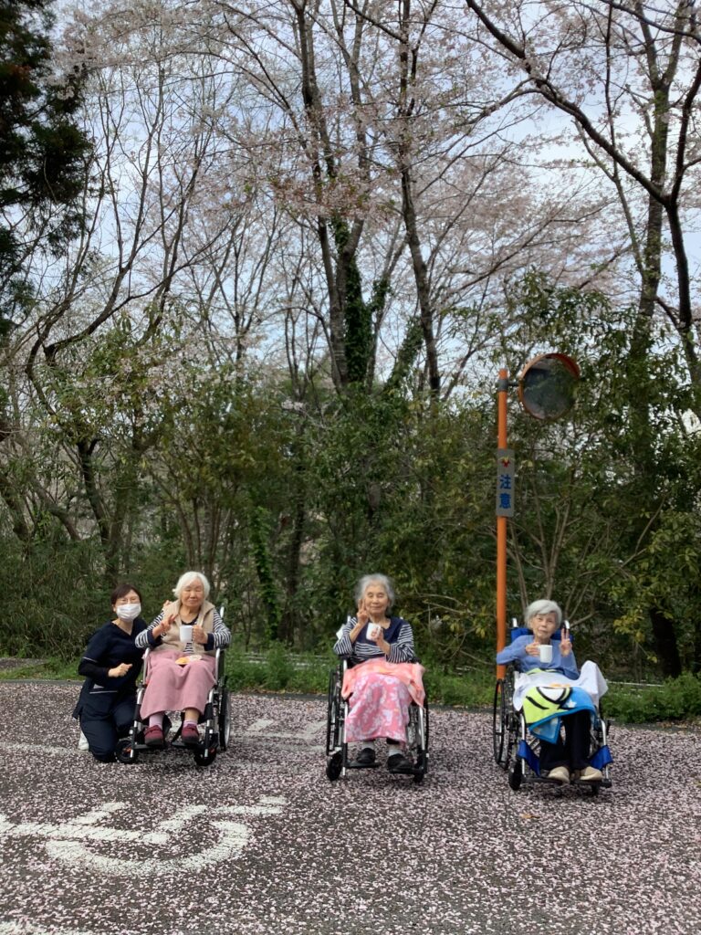 Sambil menikmati pemandangan sakura, kami bernyanyi dan minum teh, serta menghabiskan waktu yang tenang dan menyenangkan.
