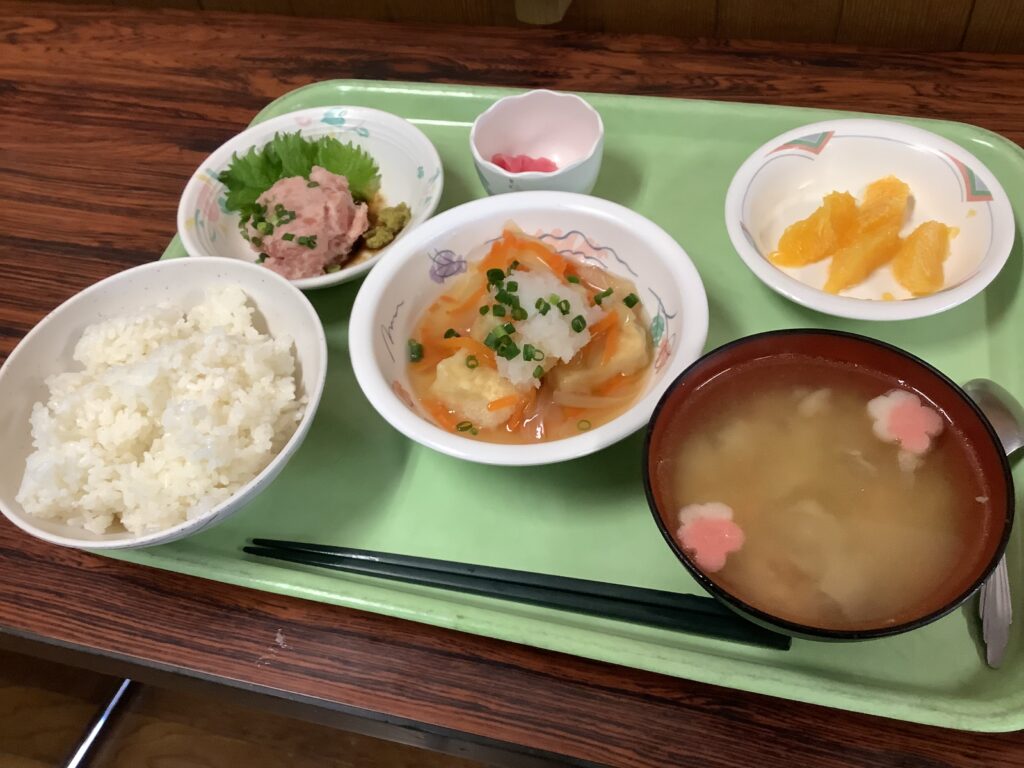 Menu makan siang hari ini terdiri dari negitoro (tuna cincang), tahu goreng kuah dashi (agedashi tofu), sup pengusir roh jahat (oniyoke-jiru), dan jeruk Valencia.