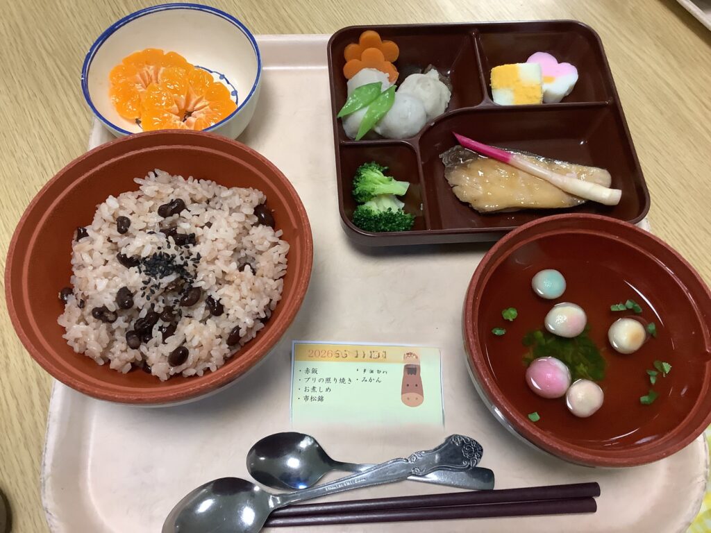 Makan siang hari ini kami sajikan berupa sekihan (nasi ketan merah), buri teriyaki, nimono (sayur rebus khas Jepang), kamaboko, ichimatsu-nishiki, sup bening, serta jeruk mikan.