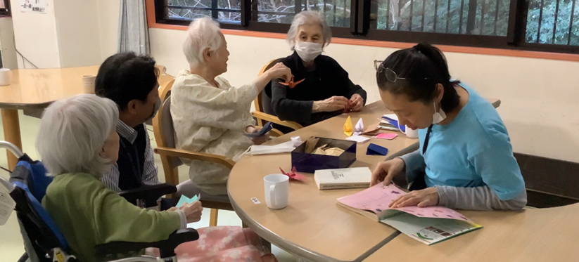 Hari ini, kami mencoba membuat burung bangau dari origami bersama para pengguna layanan.